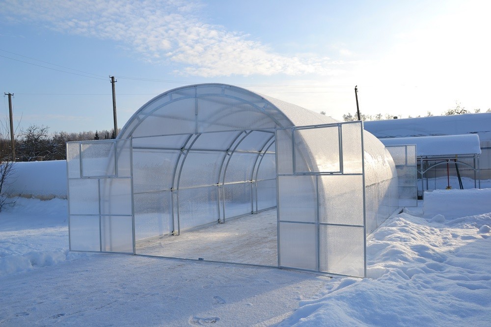 Обладая прочным сварным каркасом, теплица Агросфера-Стандарт выдерживает снеговую нагрузку 50 кг на м2 (соответствует 25 см свежевыпавшего снега). Это значит, что покрытая поликарбонатом теплица спокойно переносит суровую российскую зиму.
