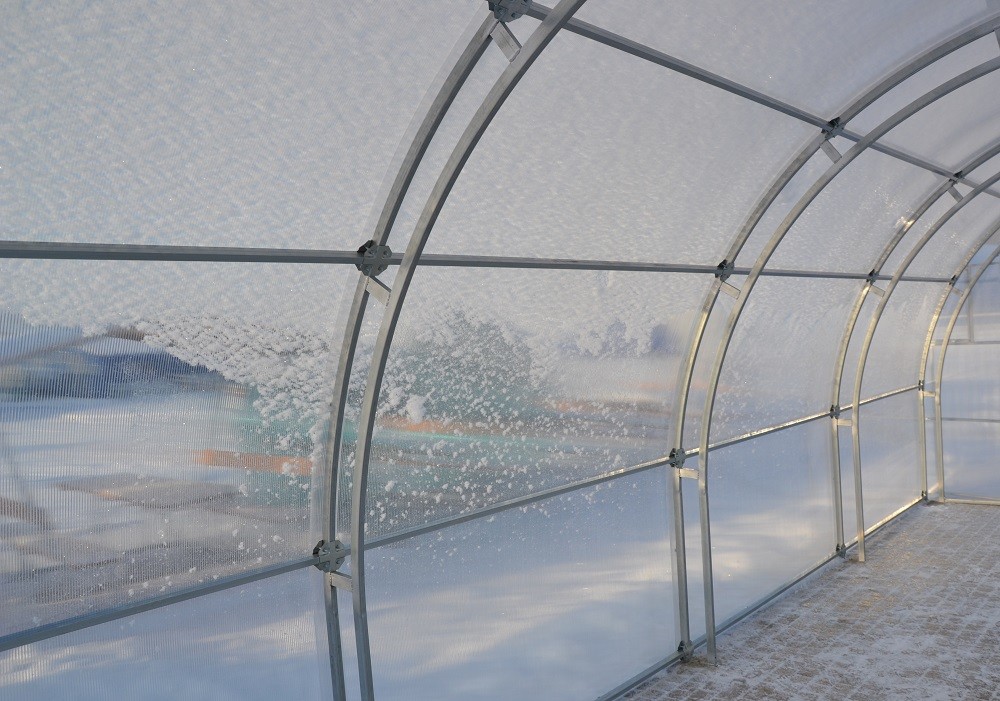 Каркас из двойных дуг Агросфера-Простор выдерживает снеговую нагрузку 240 кг на м2. Это значит, что покрытая поликарбонатом теплица прекрасно проявляет себя даже при очень сильных снегопадах.