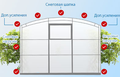 Обладая прочным сварным каркасом с увеличенным количеством дуг (шаг дуги — 67 см), теплица Агросфера-Плюс выдерживает снеговую нагрузку 70 кг на м2 (соответствует 30 см свежевыпавшего снега). Это значит, что покрытая поликарбонатом теплица спокойно переносит снежную российскую зиму.